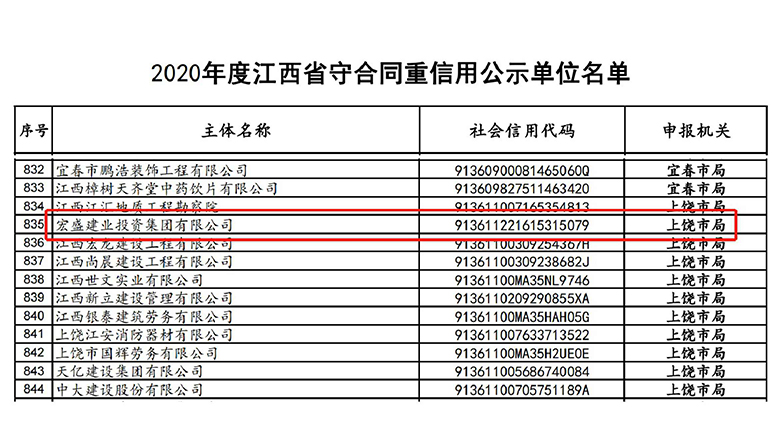 江西省市場(chǎng)監(jiān)管局于2021年6月公布了《2020年度江西省“守合同重信用”公示單位》,共計(jì)1091家企業(yè)上榜。宏盛建業(yè)投資集團(tuán)有限公司憑借科學(xué)、高效的合同與信用管理機(jī)制和出色的履約能力,自2016年以來(lái)連續(xù)5年獲得此項(xiàng)榮譽(yù)。