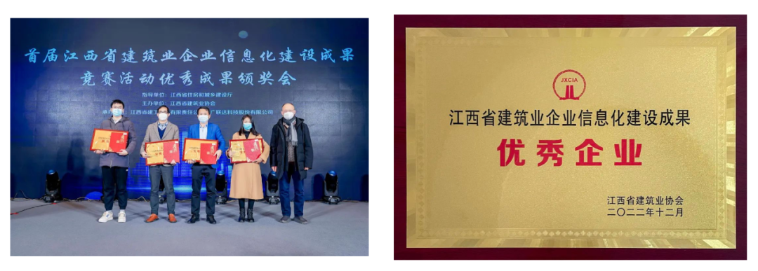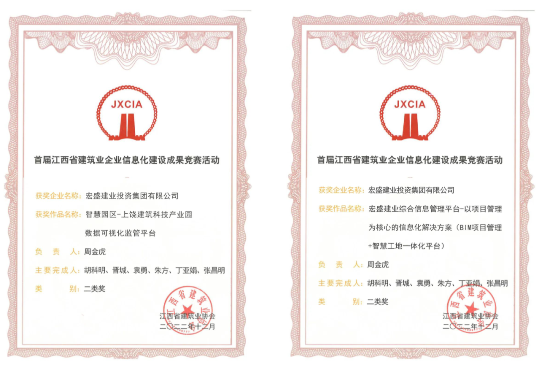 信息管理平臺獲江西省建筑業(yè)企業(yè)信息化建設(shè)成果企業(yè)級二類獎,智慧園區(qū)平臺獲江西省建筑業(yè)企業(yè)信息化建設(shè)成果項(xiàng)目級二類獎。