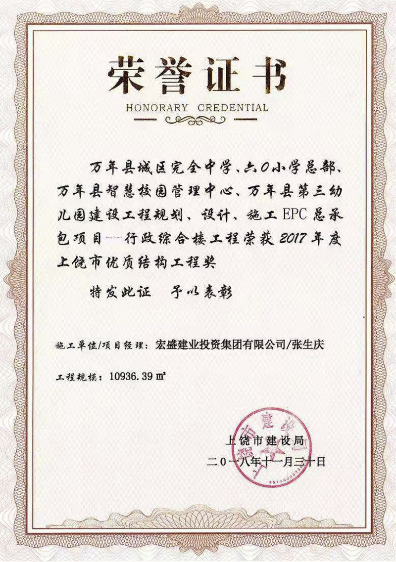 2017年5月至2018年10月參與萬年縣城區(qū)完全中學、六0小學總部建設(shè)工程項目,項目榮獲2017年度上饒市優(yōu)質(zhì)結(jié)構(gòu)工程獎