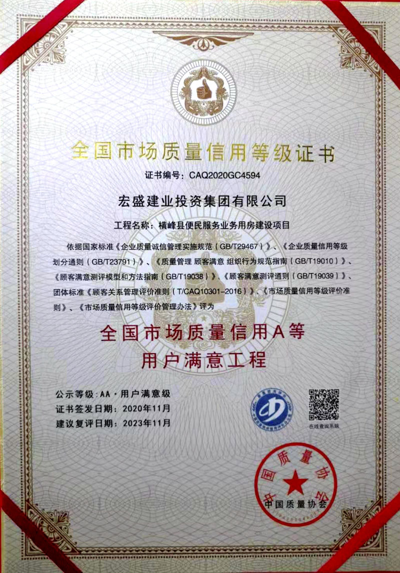 2018年10月-12月參與橫峰縣便民服務業(yè)務用房建設(shè)項目,項目獲評全國市場質(zhì)量信用A等 用戶滿意工程