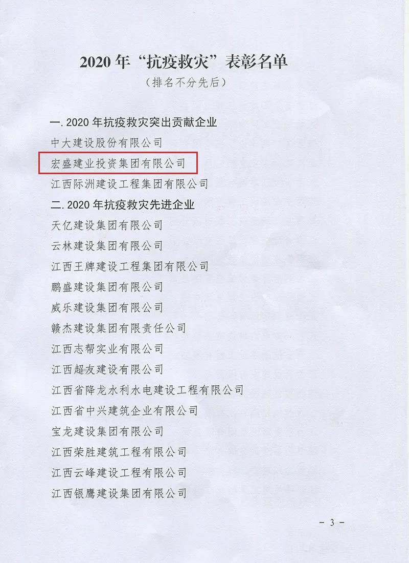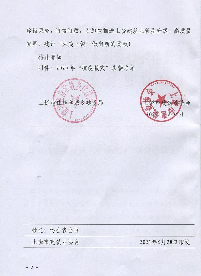 近日,經上饒市建筑業(yè)協(xié)會組織評選推薦、上饒市住房和城鄉(xiāng)建設局黨組審核批準,對“抗疫救災“中作出重要貢獻的建筑企業(yè)予以通報表彰。集團獲評“2020年抗疫救災突出貢獻企業(yè)“!