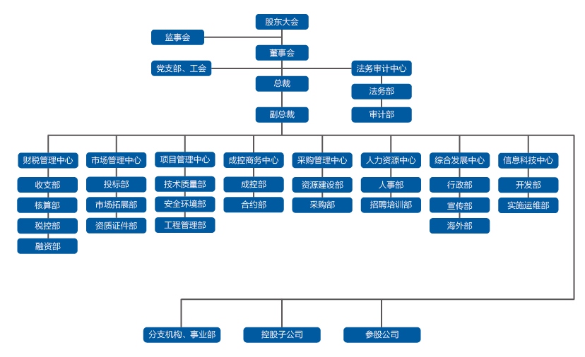 2. The headquarter of the group has nine centers: Comprehensive Development Center (under the Administration Department, Ministry of Commerce, Overseas Department), Legal Audit Center (under the Administrative Department, Audit Department), Finance and Taxation Management Center, and Market Management Center (under the Marketing Department) , Qualification Department), Project Management Center, Chengkong Business Center, Information Technology Center, Human Resources Center, New Media Center.