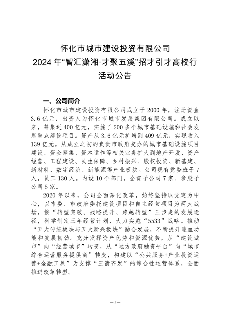 懷化市城市建設(shè)投資有限公司2024年“智匯瀟湘·才聚五溪”招才引才高校行活動公告