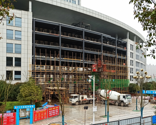 走進市民服務中心D棟施工現(xiàn)場,只見泵車正在澆筑六樓混凝土,3臺攪拌車有序作業(yè)、升降機上下忙碌,工人們戴著口罩卯足干勁,工地上呈現(xiàn)一派熱火朝天的景象?!盀榱粟s進度,我們從其他項目臨時借調人員過來。” 項目負責人向躍蘭告訴記者,現(xiàn)在工地上有40多名工人,他們在抓緊施工的同時,關閉員工食堂,向政府食堂報餐,實行“盒飯打包、分散就餐”,確保施工、防疫“兩不誤”。