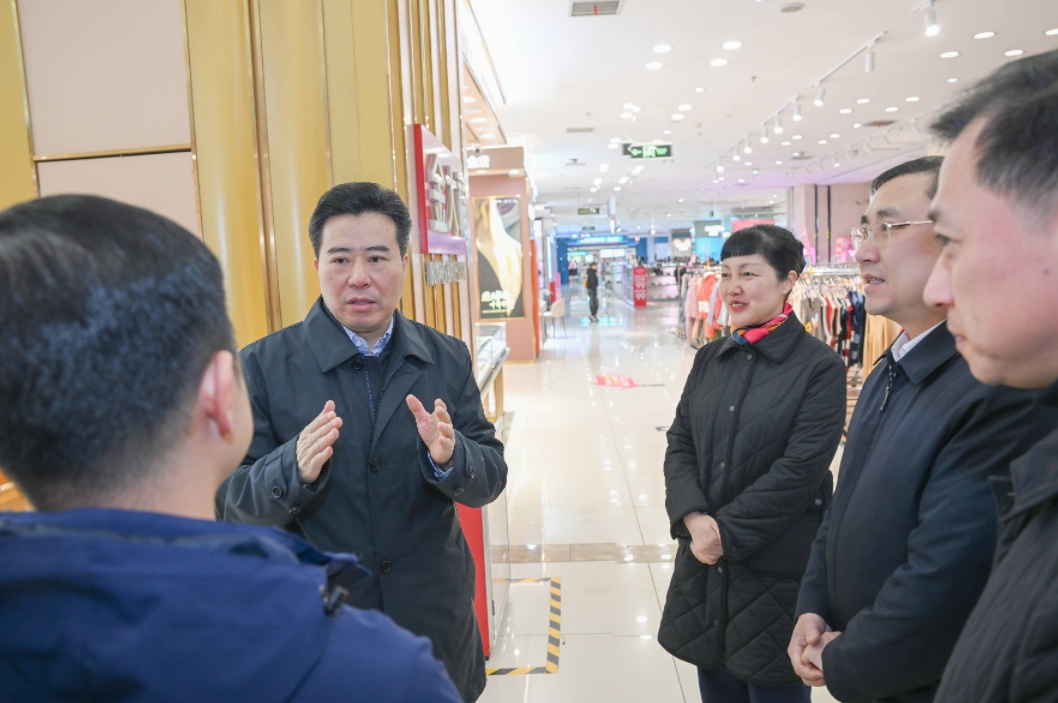 (2月22日上午,市委副書(shū)記、市長(zhǎng)黎春秋專(zhuān)題調(diào)研區(qū)域性消費(fèi)中心城市建設(shè)及非遺體驗(yàn)區(qū)項(xiàng)目提質(zhì)整改優(yōu)化情況。圖為黎春秋在通程商業(yè)廣場(chǎng)調(diào)研。懷化日?qǐng)?bào)全媒體記者 潘雨 攝)