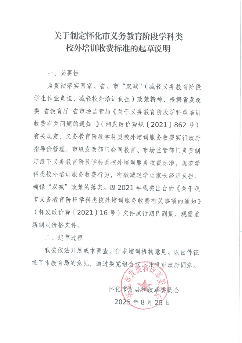 關(guān)于制定懷化市義務(wù)教育階段學(xué)科類校外培訓(xùn)收費(fèi)標(biāo)準(zhǔn)的起草說明