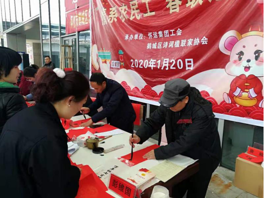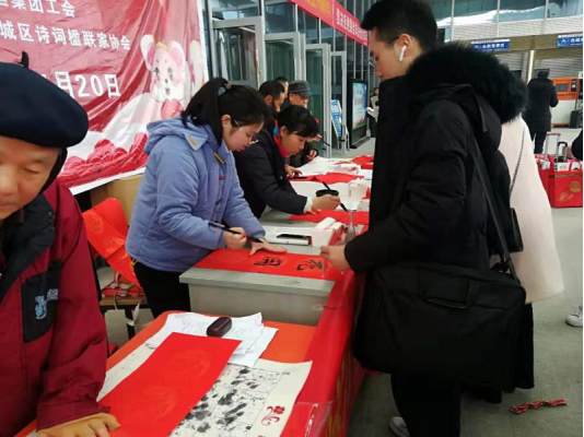 1月20日,懷運(yùn)集團(tuán)工會(huì)聯(lián)合鶴城區(qū)詩(shī)詞楹聯(lián)協(xié)會(huì)在懷化綜合客運(yùn)樞紐站開展“情系農(nóng)民工,春聯(lián)送祝?!被顒?dòng)。