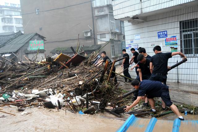 救援民警在沃溪村將堵塞物移除
