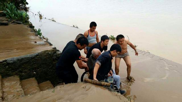 沃溪村一組財高坪巖屋橋,因橋洞狹窄,被上流沖下來的樹樁、木材、竹竿等雜物堵塞得嚴(yán)嚴(yán)實(shí)實(shí),形成堰塞湖,壓力巨大,如若不及時疏通,險情將進(jìn)一步升級。救援民警一面聯(lián)系挖機(jī)前來協(xié)助救援,一面與洪流“肉搏”,一點(diǎn)一點(diǎn)艱難地將堵塞物移除,疏通排水橋洞泄洪。寧鄉(xiāng)鋪村交溪口組,防洪堤突然潰壩,來不及撤離的30多戶村民被突如其來的洪流圍困,在孤島迫切等待救援,情況萬分危急。救援民警趟過湍急的洪流,挨家挨戶通知并轉(zhuǎn)移被困村民。獨(dú)居的癱瘓老人楊大爺也在民警的幫助下得以安全轉(zhuǎn)移。