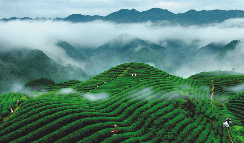 在碣灘山的山坡上,坐落著3000余畝蓊郁青翠的碣灘茶園,茶園綠染碣灘兩岸,有“栽培布局奪天工,碧毯陳鋪十五峰,唯有碣灘茶最好,知音海外話田中”之贊語(yǔ)。碣灘茶香遍全球,歷史久遠(yuǎn),在唐代已成為貢茶,歷久不衰。`1972年,當(dāng)時(shí)的日本首相田中角榮來(lái)華訪問(wèn),曾向周恩來(lái)總理夸贊碣灘茶,并稱之為“中日友好之茶”。