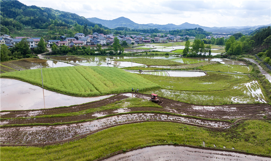 4月27日,在懷化市鶴城區(qū)黃金坳鎮(zhèn)汪家村高標(biāo)準(zhǔn)農(nóng)田示范基地,農(nóng)戶搶抓春耕好時(shí)節(jié),正在翻耕農(nóng)田。
