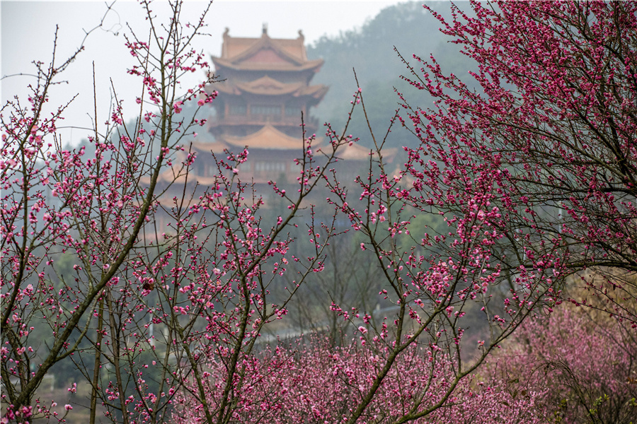 2月24日,洪江區(qū)嵩云山華嚴閣附近的梅花競相綻放,開啟了獨有的“梅”好時光。(李鋼 攝)