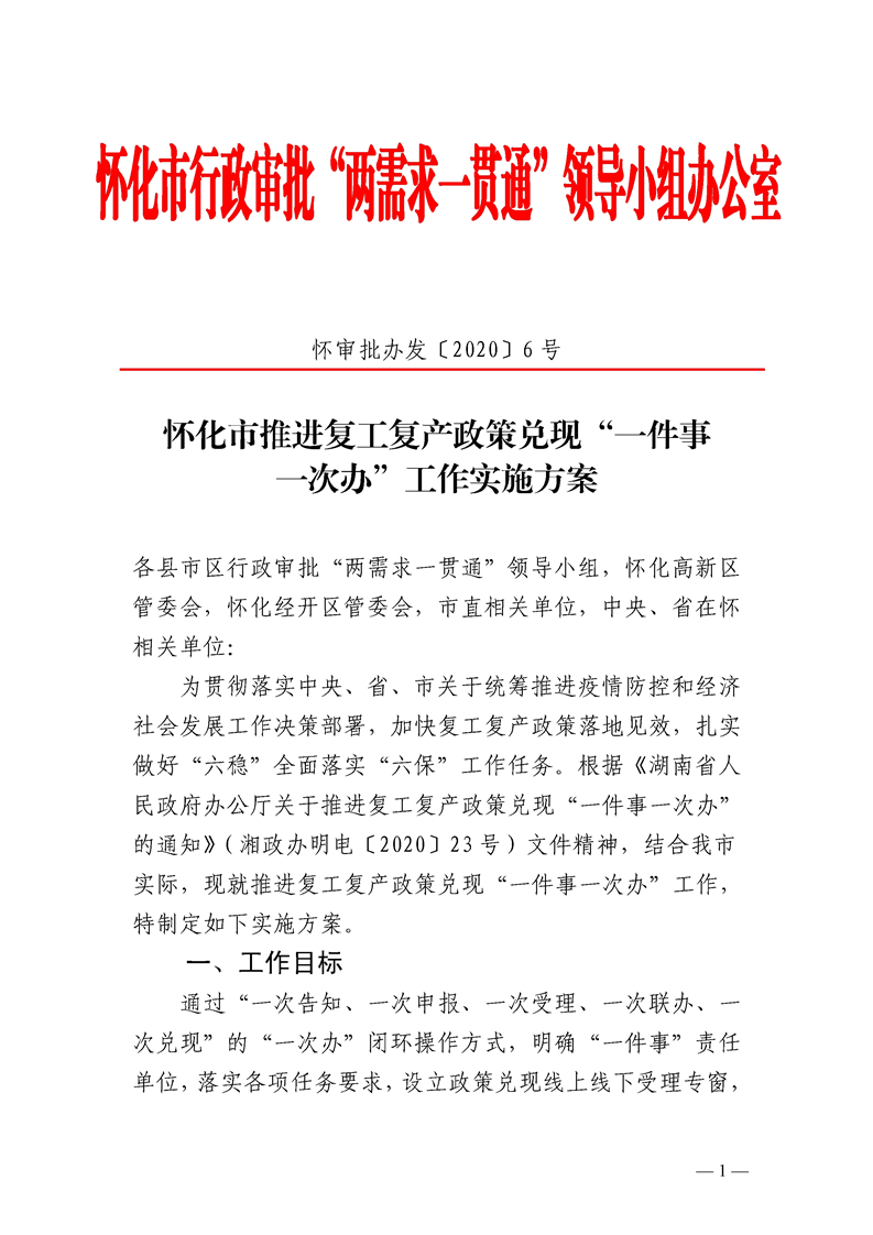 懷化市推進(jìn)復(fù)工復(fù)產(chǎn)政策兌現(xiàn)“一件事一次辦”工作實(shí)施方案