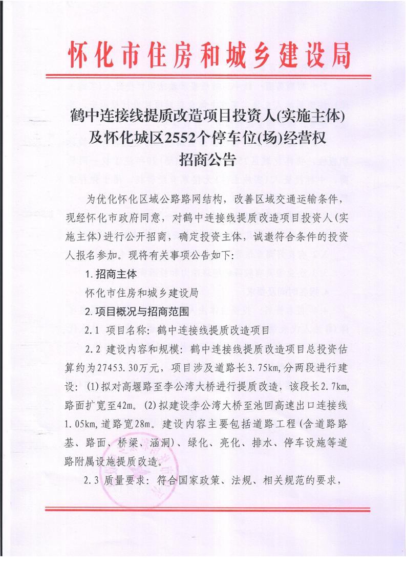 鶴中連接線提質(zhì)改造項(xiàng)目投資人(實(shí)施主體)及懷化城區(qū)2552個(gè)停車位(場)經(jīng)營權(quán)招商公告