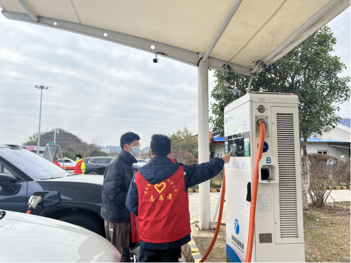 大年初三,外出旅游獲探親訪友的車輛越來越多,考慮到許多司乘人員對充電樁使用生疏,為更好服務(wù)司乘朋友,縮短排隊充電時間,新晃片區(qū)管理所“路燈”志愿者們一早來到新晃服務(wù)區(qū),在電動車充電樁處設(shè)置服務(wù)臺,對前來充電的司乘人員進行教學(xué)示范,保障其快速充電,并送上新年祝福。