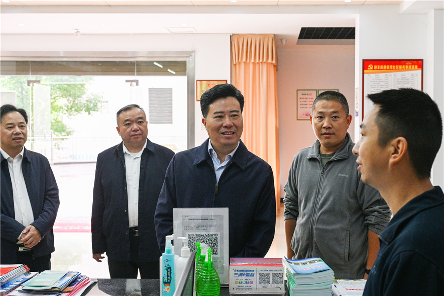 (10月9日上午,市委副書記、市長黎春秋以“四不兩直”方式在鶴城區(qū)督導(dǎo)檢查“一迎三創(chuàng)”工作。圖為黎春秋在迎豐街道銀灣社區(qū)檢查。懷化日報(bào)全媒體記者 潘雨 攝)