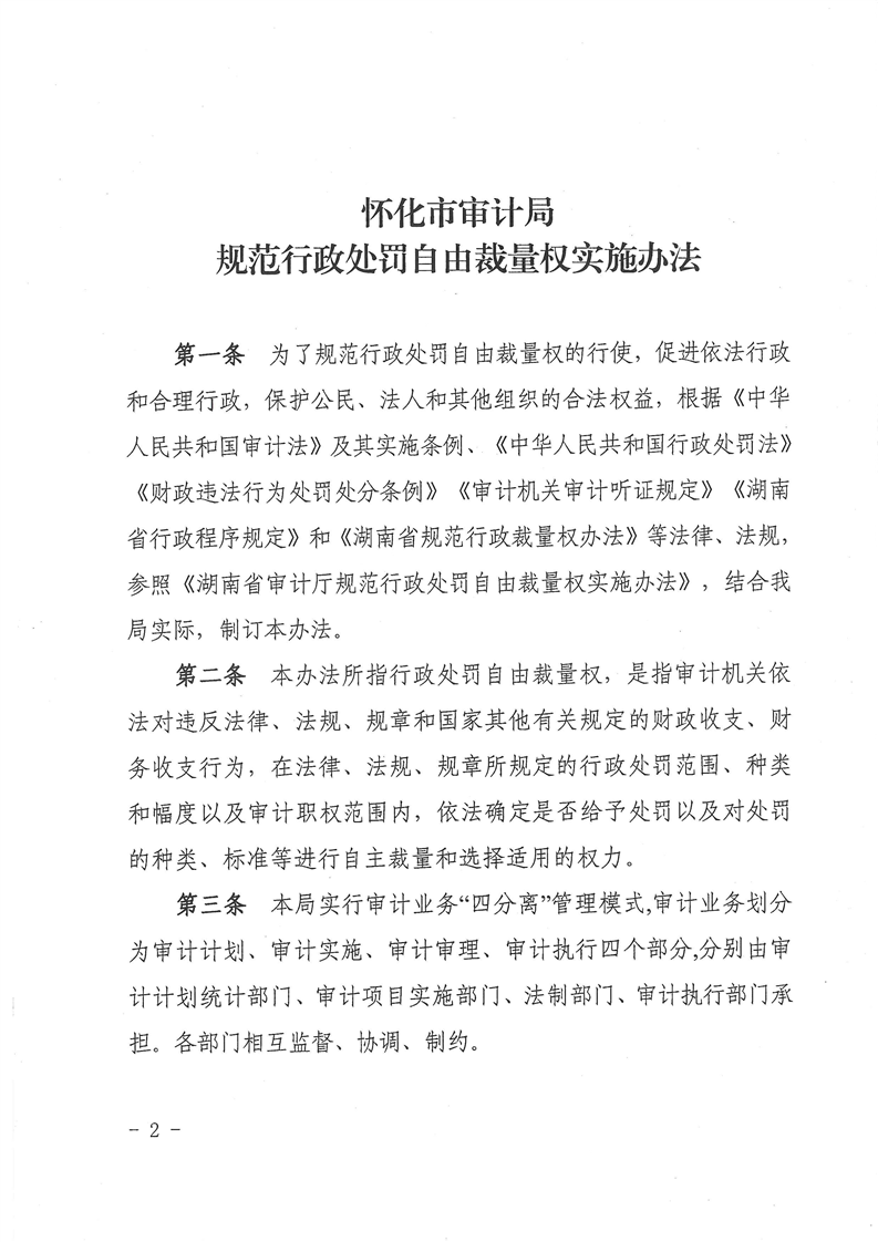 懷化市審計局關(guān)于印發(fā)《懷化市審計局規(guī)范行政處罰自由裁量權(quán)實施辦法》的通知